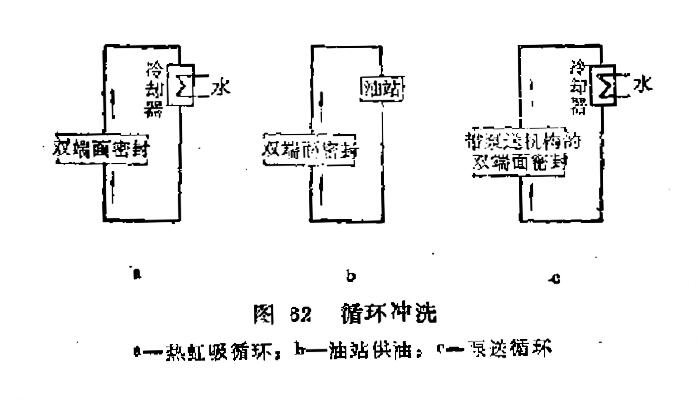 循環沖洗是通過一個泵送裝置使外加的密封流體進行循環(圖62)。這里有兩點需引起注意,一是“泵送裝置”,可以是外加的油站和密封腔形成閉合回路進行循環,也可在密封腔中裝設一個泵,或者是用熱虹吸的原理使流體循環。另一點要注意的是“外加的密封流體”。這種沖洗方式用在雙端面或多端面密封上,在單端面密封上不采用。