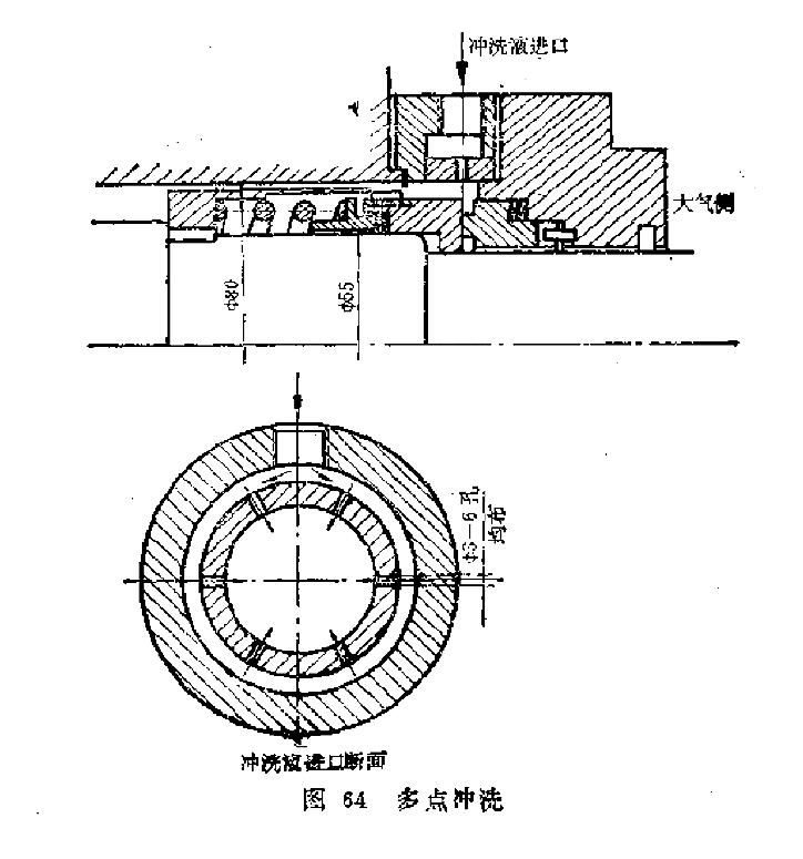 多點沖洗(圖64):沖洗液沿圓周多個小孔同時進入密封腔,并起沖洗作用。多點沖洗克服了單點沖洗的缺點,使摩擦副周圍的溫度分布更均勻。但結構較為復雜,需增加一個沖洗環,內設6~8個小孔,孔徑3~4mm。多點沖洗用在易汽化的介質中,也可用在產生摩擦熱較多的高pv值場合。