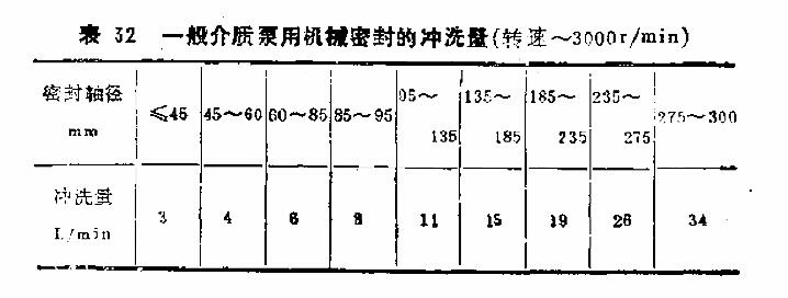 理論上講沖洗量是按密封裝置的熱平衡原理計算確定。產生的熱量中有摩擦副的摩擦熱、密封旋轉產生的攪拌熱、泵內流體傳到密封處的熱量等。散失熱量的方式有壓蓋急冷、密封腔夾套冷卻和自然冷卻。產生的熱量減去散失的熱量,兩者的差值應是沖洗帶走的熱量。該計算麻煩,有很多數據是選取的,計算f結果沒有多大的意義。根據長期的實踐和經驗,沖洗量在3~30L/ min,可根據密封規格(直徑)和介質的種類選取(見表32)。